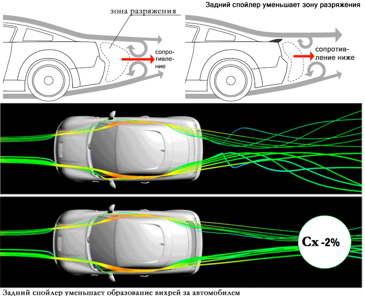 Спойлер же направляет поток воздуха таким образом, что после прохождения кузова автомобиля завихрения не образуются. Некоторые спойлеры имеют форму перевернутого крыла самолета и часто называются «антикрыльями». Эти конструкции не только предотвращают образование завихрений, но и благодаря своей форме создают эффект, противоположный завихрению. Таким образом, на высокой скорости автомобиль не поднимается, а, наоборот, прижимается к дороге.