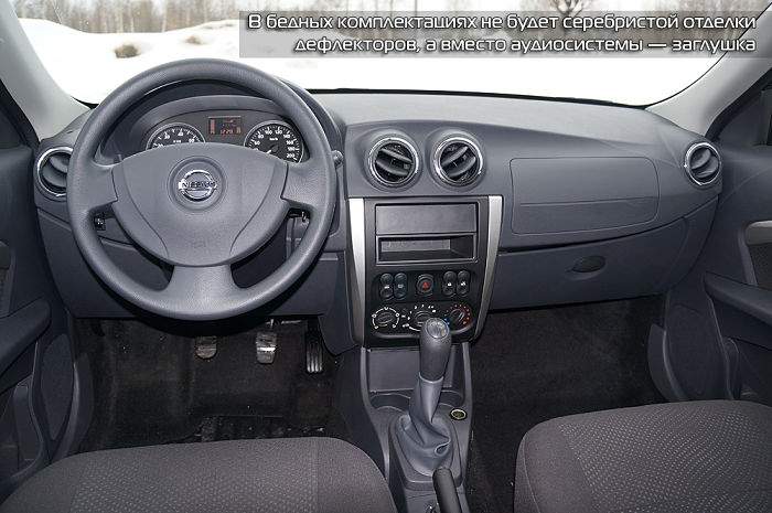 В топ-модификациях это однообразие немного разбавляется серебристыми окантовками приборов и дефлекторов обдува, современной аудиосистемой, серебристыми элементами на торпедо и дверных картах, а также кожаной обивкой руля. Тем не менее, полностью искоренить «логановское» впечатление эти доработки не в силах.