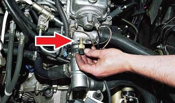 Точное место установки данного датчика температуры у разных авто отличается, но незначительно. Он может устанавливаться в головке блока цилиндров возле корпуса термостата, либо же на самом корпусе термостата. Он обязательно располагается возле отводящего патрубка, по которому жидкость идет в радиатор. Возле этого патрубка он располагается для того, чтобы передавать точные данные о температуре.