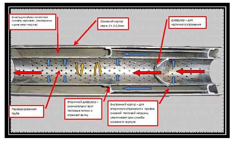 Пламегаситель представляет собой конструкцию из двух труб, которая устанавливается в выхлопную систему вместо катализатора. Первая труба выполняет функцию самого пламегасителя, а вторая, расположенная снаружи, служит ее защитным корпусом.