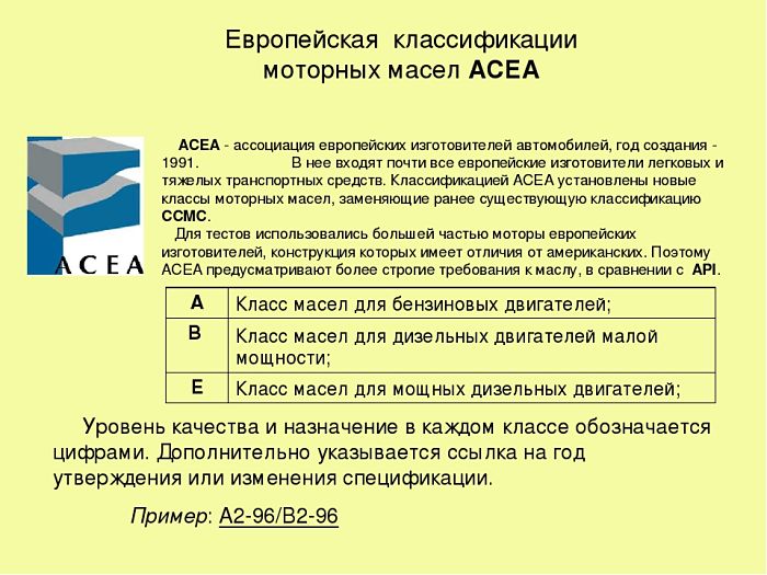 Над разработкой этой классификации трудилась Ассоциация производителей автомобилей в Европе. Подразделяет смазку на 3 больших семейства: