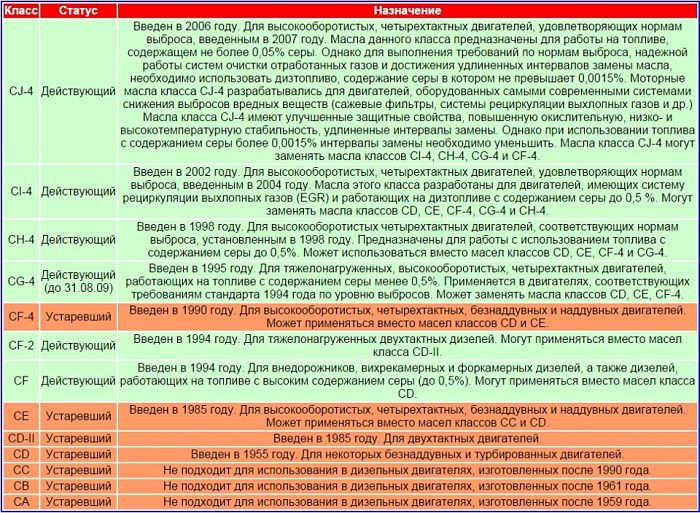 Смазочные материалы, одновременно подходящие для дизельных двигателей и бензиновых силовых установок, имеют двойное обозначение. Например, SG/CF.
