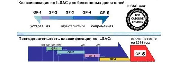 Система классификации ILSAC делит масла на пять основных категорий (от GF1 до GF5). В январе 2017 года планируется введение нового стандарта GF6. Чем выше номер после буквенного обозначения GF, тем более качественным считается данное моторное масло.