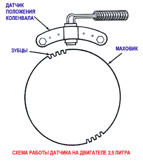 На большинстве автомобилей используются индукционные датчики коленвала. Их работа основана на изменении магнитного поля, создаваемого устройством, когда через него проходит металлический объект. В двигателях это реализуется следующим образом: на коленвале установлен специальный металлический зубчатый синхродиск, который обычно монтируется на шкив генератора. По окружности этого диска расположен зубчатый венец, в котором в одном месте отсутствуют два зуба подряд. Датчик коленвала размещается напротив этого диска на таком расстоянии, чтобы вершины зубьев попадали в магнитное поле датчика. Сигналом, указывающим на положение коленчатого вала, служат именно эти два отсутствующих зуба. Когда участок диска без зубьев проходит через магнитное поле датчика, происходит изменение, которое датчик фиксирует и передает на блок управления.