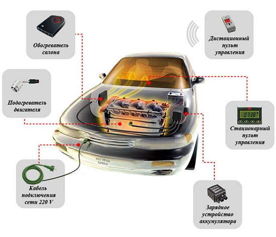 В зависимости от своего назначения и принципа работы предпусковой подогреватель может иметь различные размеры и мощность, предназначенные для предварительного нагрева двигателя без его холодного запуска. Кроме того, он может использоваться для обогрева салона автомобиля, стекол и дворников. Автономное оборудование включает котел с камерой сгорания и радиатором, а также трубопроводную систему для подачи топлива, насосы для перекачки топлива и охлаждающей жидкости. В его состав входят термореле, которое управляет вентилятором климатической системы, электронный блок управления и устройство для запуска подогревателя.