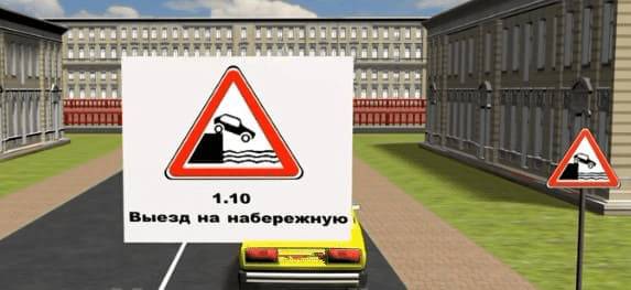 Знак «Выезд на набережную» 1.10 информирует автомобилистов о том, что они приближаются к дороге, проходящей вдоль набережной (включая участки без ограждений у водоемов) и настоятельно рекомендует снизить скорость и проявить повышенное внимание.