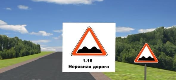 Знак 1.16 информирует водителей о приближении к участкам дороги с различным уровнем дорожного покрытия: