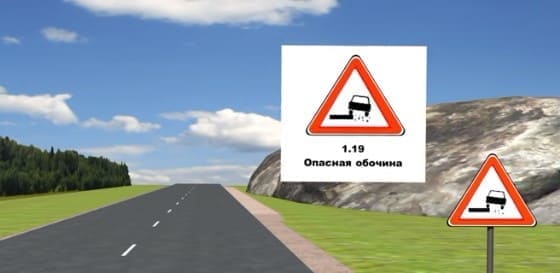 Суть информации, передаваемой знаком 1.19, заключается в предупреждении о существенном превышении (снижении более 40 мм) уровня обочины над уровнем дорожного полотна, что является угрозой безопасности движения на данном отрезке трассы. Тем не менее, в нем не содержится запрета выезда на обочину. Допускается применение знака 1.19 во временном исполнении.