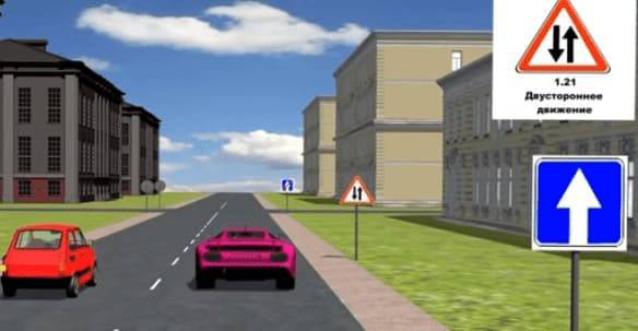 Знак 1.21 устанавливается в конце участка одностороннего движения, переходящего в участок двустороннего движения.