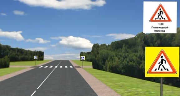 Функциональное назначение знака 1.22 четко отражено в его названии – он информирует водителей о приближении к участку дороги, где необходимо уступить дорогу пешеходам, переходящим проезжую часть по обозначенному переходу. За пределами населенных пунктов этот знак устанавливается на всех пешеходных переходах. Также стоит отметить, что знак выполнен на фоне желтого световозвращающего квадрата.