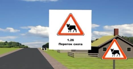 Знак 1.26 предупреждает водителей о том, что впереди могут находиться сельскохозяйственные животные. Обычно такие перегоны располагаются вблизи ферм, скотных дворов и хозяйств. Особенно осторожными следует быть в отношении животных, находящихся у края дороги. Испуг, вызванный приближающимся транспортом, может заставить их совершить неожиданные поступки.