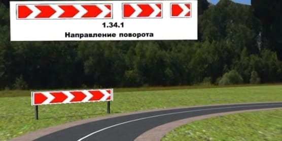 Сообщает о приближении к повороту с малым радиусом, где из-за ограниченной видимости могут возникнуть трудности с определением направления движения. Знак устанавливается на внешней стороне поворота. Он может быть представлен в виде одной или двух повторяющихся стрелок. Также возможно его использование в качестве указателя направления объезда во время проведения ремонтных работ.