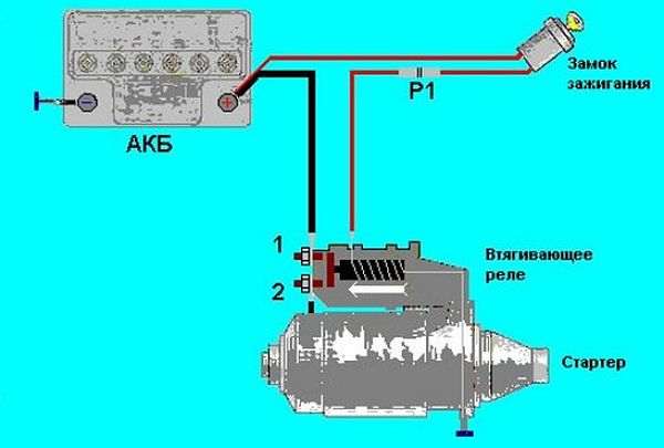 Для минимизации потерь на сопротивлении «плюсовой» провод питания имеет большое сечение и соединен напрямую с аккумулятором и втягивающим реле. «Минусом» в этой системе служит сам двигатель.