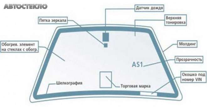 - AS-маркировка ветрового стекла с цифрами 1-3, обозначающие степень прозрачности. Максимально прозрачное стекло обозначается как AS1;